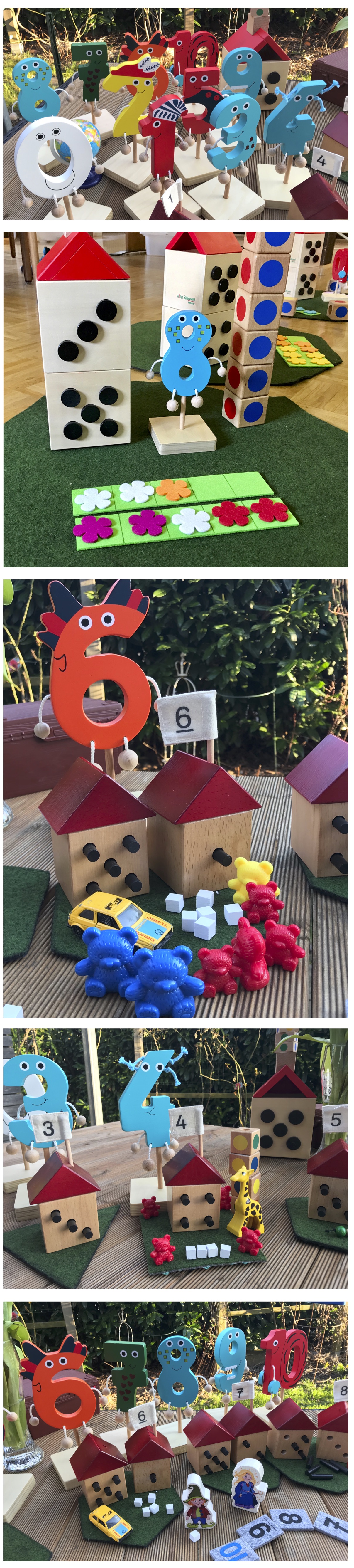 - Number puppets from 0 to 10 - both wooden or as plush toys- wooden houses 0 to 10 with roofs, 55 window pegs, house numbers